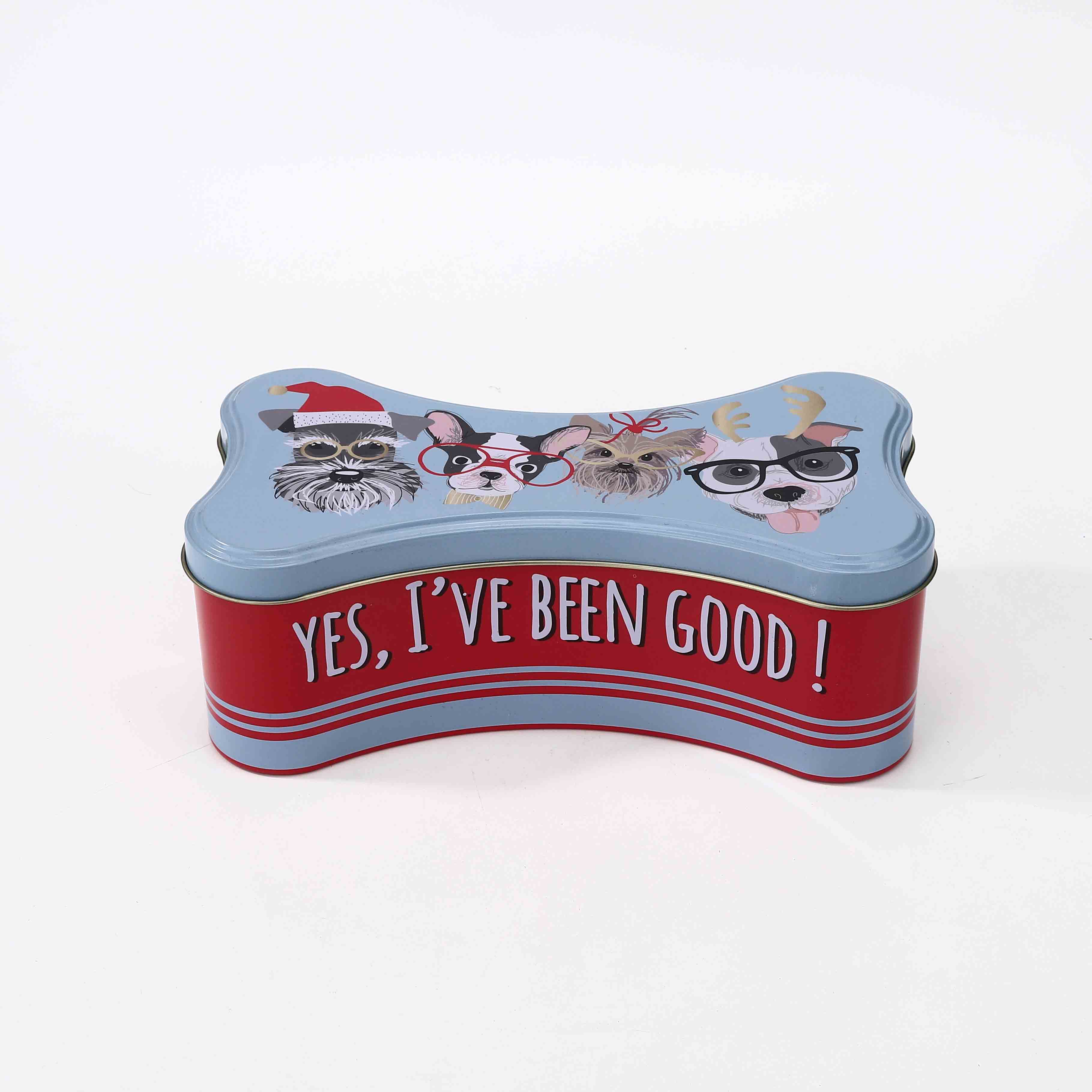 Usage: This tin box’s design inspiration is Special Bone Shape to show the cute Style. Very suitable for the pet goods, candy and biscuit. The different picture print to show the different style.